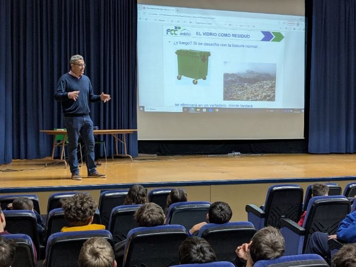 El pasado martes 13 de enero de 2026, el gerente de FCC ámbito, Reciclaje de vidrio y paneles fotovoltaicos, Carlos Mallen, ofreció una enriquecedora charla al alumnado de 2º de ESO en el Salón de Actos del colegio La Salle Gran Vía (Zaragoza), dentro de la asignatura de Tecnología. Durante la sesión, los estudiantes pudieron conocer de primera mano cómo se gestionan y transforman los residuos de envases de vidrio en nuevos y ecológicos envases de vidrio, convirtiendo así los residuos en materia prima secundaria de alta calidad mediante avanzados procesos de tratamiento y clasificación que tienen lugar en la planta de Cadrete (Zaragoza).
